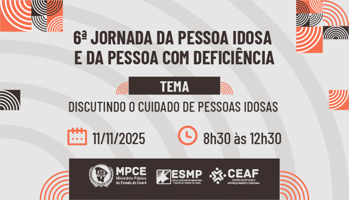 O Ministério Público do Ceará realizará, no dia 11 de novembro, a 6ª Jornada da Pessoa Idosa e da Pessoa com Deficiência com o tema “Discutindo o cuidado de Pessoas Idosas”. A iniciativa ocorrerá das 8h30 às 12h30, no auditório da Escola Superior do MP (ESMP), em Fortaleza. A atividade, aberta ao público, é uma realização da Secretaria Executiva das Promotorias de Justiça de Defesa do Idoso e da Pessoa com Deficiência e do Centro de Estudos e Aperfeiçoamento Funcional (Ceaf), com apoio da ESMP. Para participar, é necessário se inscrever pela plataforma de cursos da ESMP/Ceaf.