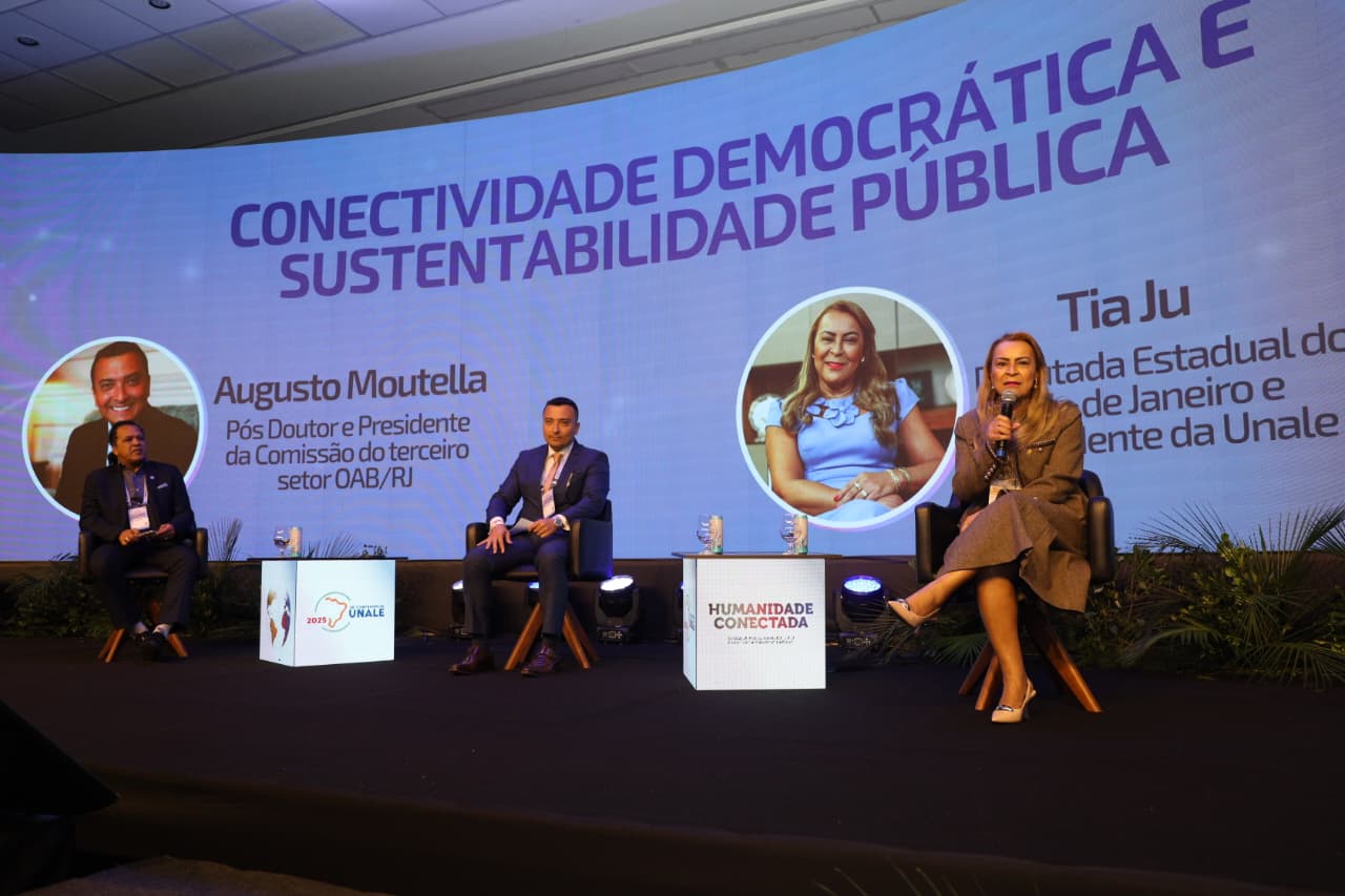 Durante exposição de painéis, a presidente da UNALE destaca o alcance da conferência e parabeniza delegação de Sergipe. A deputada Tia Ju (ALERJ), – que encerra seu mandato nesta edição – fez uma avaliação positiva do encontro. “Encerramos a gestão com a grande conferência, culminando os seminários das comissões temáticas. Trouxemos um tema essencial: humanidade conectada, meio ambiente e condições climáticas. O evento está maravilhoso, com as pessoas conectadas e disseminando esse recado no Brasil e pelas Américas.” A presidente também ressaltou a presença da COPA – Confederação dos Parlamentos das Américas, ampliando o caráter internacional da conferência.