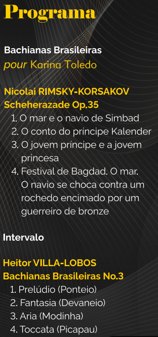 A proposta do concerto une duas obras sinfônicas de grande riqueza narrativa e musical: a Bachianas Brasileiras No. 3. de Heitor Villa-Lobos, e a Suite Sinfônica Scheherazade, de Nicolai RimSky-Korsakov. Ambas exploram universos distintos, o Brasil profundo e a fantasia oriental, mas compartilham o poder de contar histórias por meio da música.