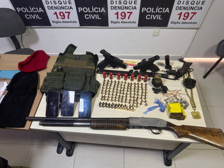 Nas diligências, foram apreendidas uma espingarda calibre 12, duas pistolas, um revólver, uma granada, diversas munições e um colete balístico. Roupas camufladas e porções de maconha também foram encontradas pelos policiais.