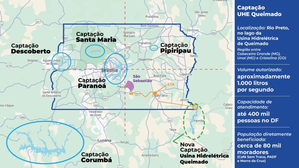 A água retirada no Lago de Queimado será tratada em uma estação a ser construída na região do Café Sem Troco, que contará também com novos reservatórios. De lá, seguirá por uma adutora até São Sebastião e Morro da Cruz, interligando-se aos demais sistemas da Caesb, como Corumbá, Santa Maria e Descoberto. Essa integração garantirá mais flexibilidade operacional e maior segurança hídrica para o Distrito Federal.