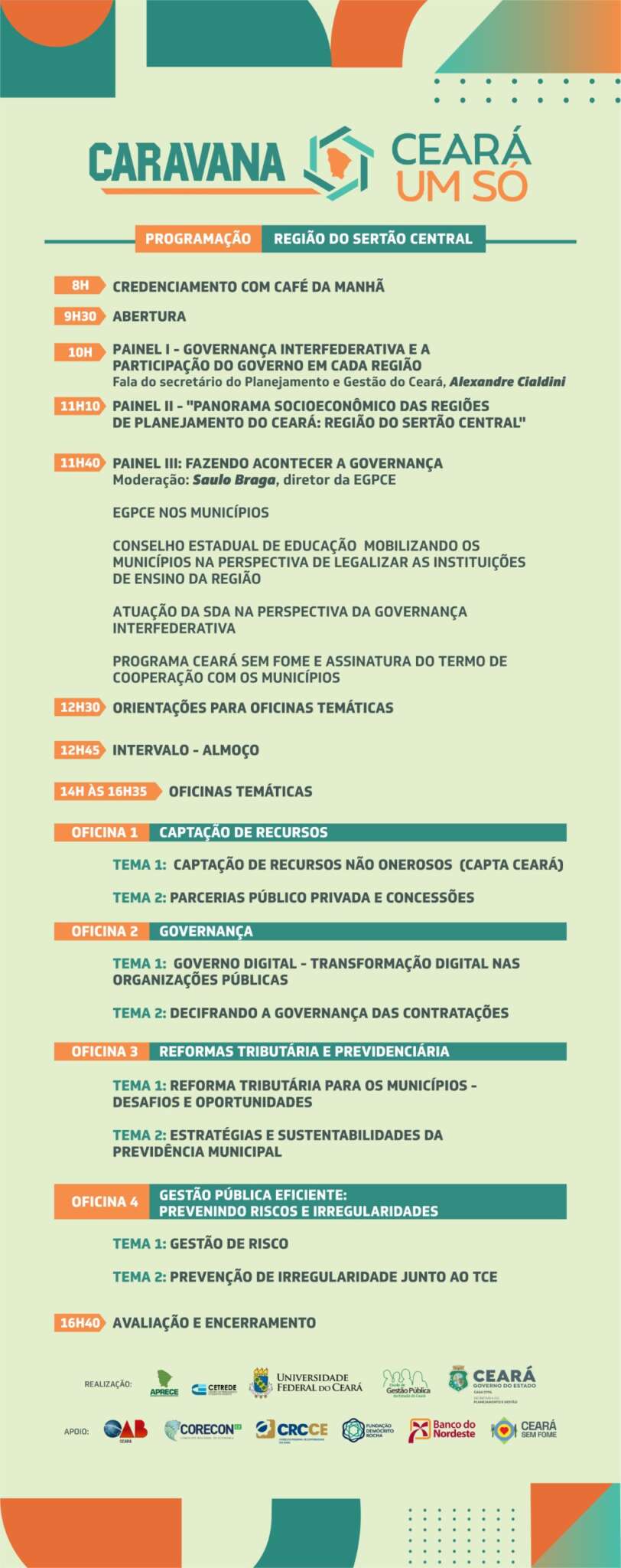 A programação da Caravana Ceará Um Só inclui a apresentação dos investimentos estaduais na região, o panorama socioeconômico do território e as perspectivas de avanços em áreas como desenvolvimento agrário e educação. O evento também conta com oficinas temáticas sobre captação de recursos, governança, reformas tributária e previdenciária e gestão pública eficiente.