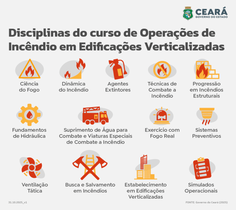 Fogo, fumaça, escadas e outros desafios simulando os cenários enfrentados no combate a incêndios urbanos. Esses elementos estão na intensa rotina dos bombeiros militares que participam da primeira turma do Curso de Operações de Incêndio em Edificações Verticalizadas (Coiev). A capacitação pioneira no estado é uma realização do Corpo de Bombeiros Militar do Ceará (CBMCE) em parceria com a Academia Estadual de Segurança Pública (Aesp).