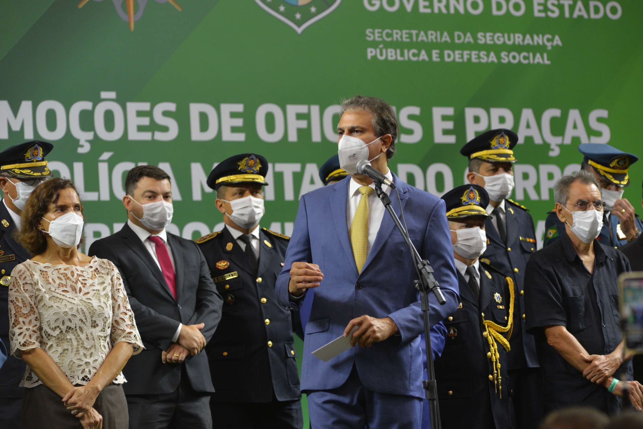 O governador Camilo Santana falou sobre o compromisso firmado na sua gestão para reconhecer e valorizar os profissionais da Segurança Pública. “Tenho um sentimento de realização, de compromisso cumprido. Vamos promover neste final de ano mais de 3.200 policiais militares e bombeiros militares. Para vocês terem uma ideia, a média de homens promovidos ao longo da história da polícia era em torno de 200 homens por ano. Nesses sete anos, nós vamos chegar a 25 mil homens da Polícia Militar e do Corpo de Bombeiros. Tem pessoas que foram promovidas duas ou três vezes no meu governo. Eu sei o que significa para vocês, porque não é só uma graduação, é um reconhecimento, é estímulo e motivação. Porque nós temos a responsabilidade de defender o povo cearense”.