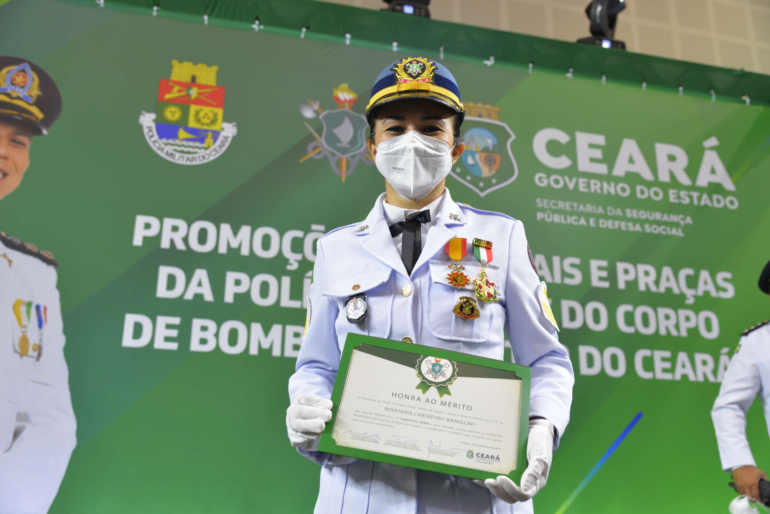 Uma dessas profissionais é a bombeira militar Mariana Ramalho, de Fortaleza, que foi promovida a terceiro-sargento. Na oportunidade, Mariana foi agraciada com o certificado de honra ao mérito, que reconhece os serviços prestados à população cearense. “Eu me sinto com o coração muito feliz. Dá motivação para seguir em frente e buscar sempre se dedicar e crescer na corporação. Eu estou tentando representar o trabalho de cada um que é imenso, é luta diariamente”, contou.