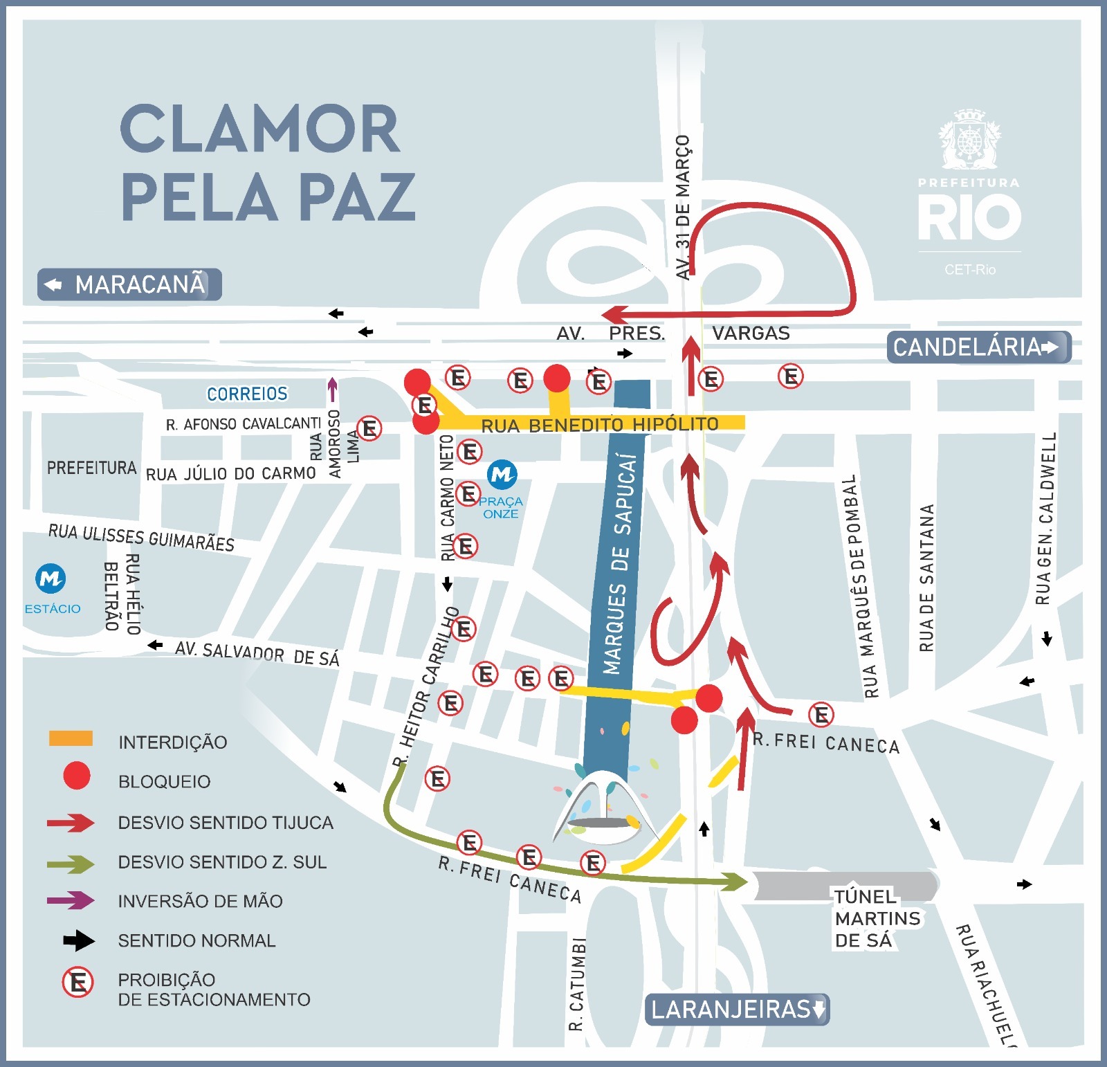 A CET-Rio irá implantar um esquema especial de trânsito no Centro e em seus principais acessos para viabilizar a realização do evento “Clamor pela Paz”, que acontecerá no sábado (15/11) na Praça da Apoteose, no Sambódromo.