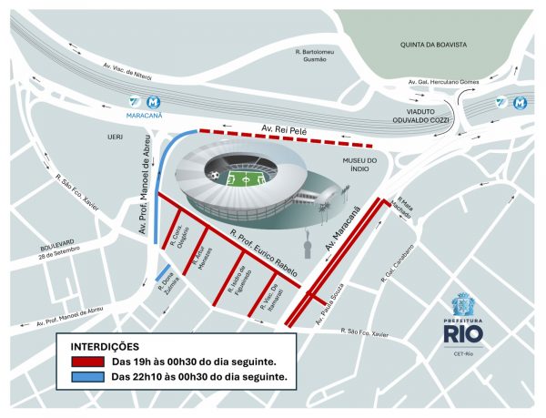 A CET-Rio realizará nesta quinta-feira (27/11) operação de trânsito para o jogo entre Fluminense e São Paulo, às 20h30, no Maracanã, pelo Campeonato Brasileiro. As interdições ao tráfego de veículos na região começam a partir das 19h e vão até a 0h30 de sexta-feira (28/11). Além dos locais regulamentados com proibição de estacionamento, outras vias também estarão restritas ao estacionamento a partir das 10h.
