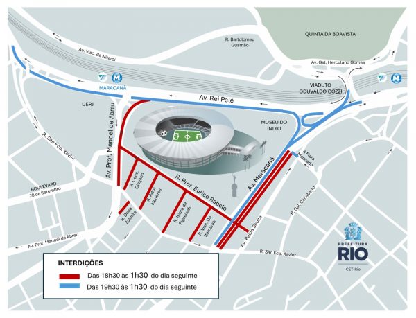 A CET-Rio montou esquema de trânsito para o clássico entre Fluminense e Flamengo, nesta quarta-feira (19/11), às 21h30, no Maracanã, pelo Campeonato Brasileiro. As interdições ao tráfego de veículos na região começam a partir das 18h30 e vão até 1h30 de quinta-feira (20/11). Além dos locais regulamentados com proibição de estacionamento, outras vias também estarão restritas ao estacionamento a partir das 10h.