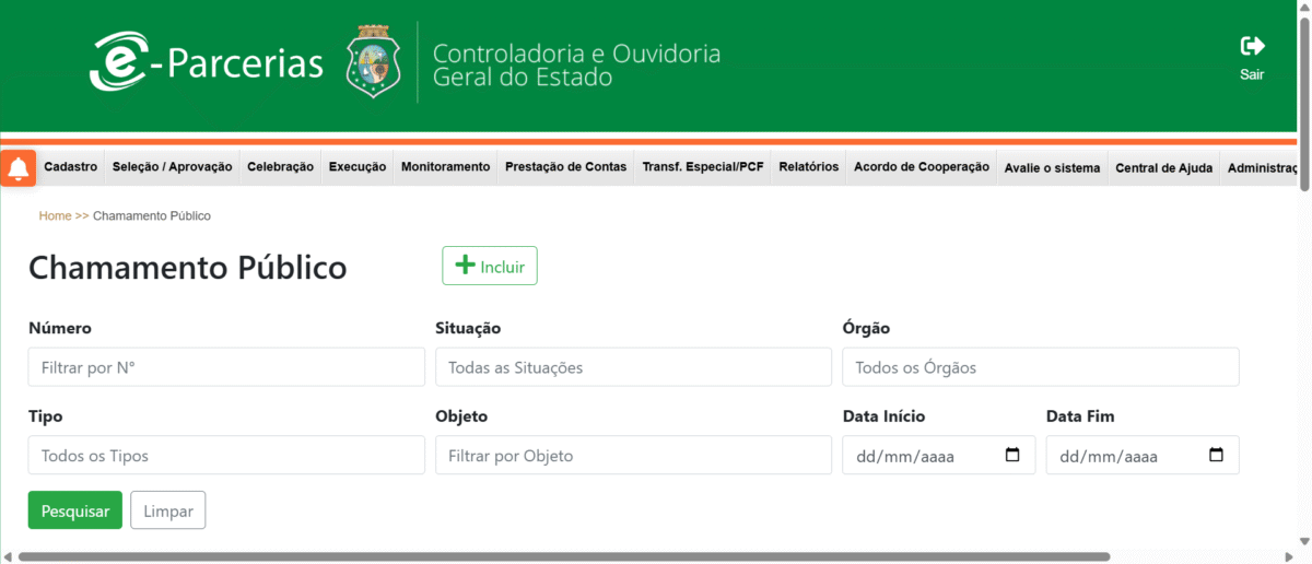 A nova funcionalidade tem como objetivo possibilitar o cadastro e a divulgação dos Editais de Chamamento Público, bem como das Dispensas e Inexigibilidades realizadas pelas Secretarias/Órgãos, concedentes, do Governo do Ceará, reforçando o compromisso da CGE com a ampla transparência e publicidade.