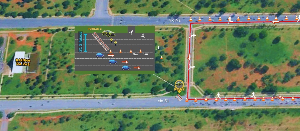 Durante o evento, três faixas das vias S1 e N1, próximas ao canteiro central, serão interditadas entre o Centro de Convenções Ulysses Guimarães e a via de ligação S1/N1, localizada entre a Catedral Rainha da Paz e a Praça do Cruzeiro. As demais faixas permanecerão liberadas para o tráfego de veículos.