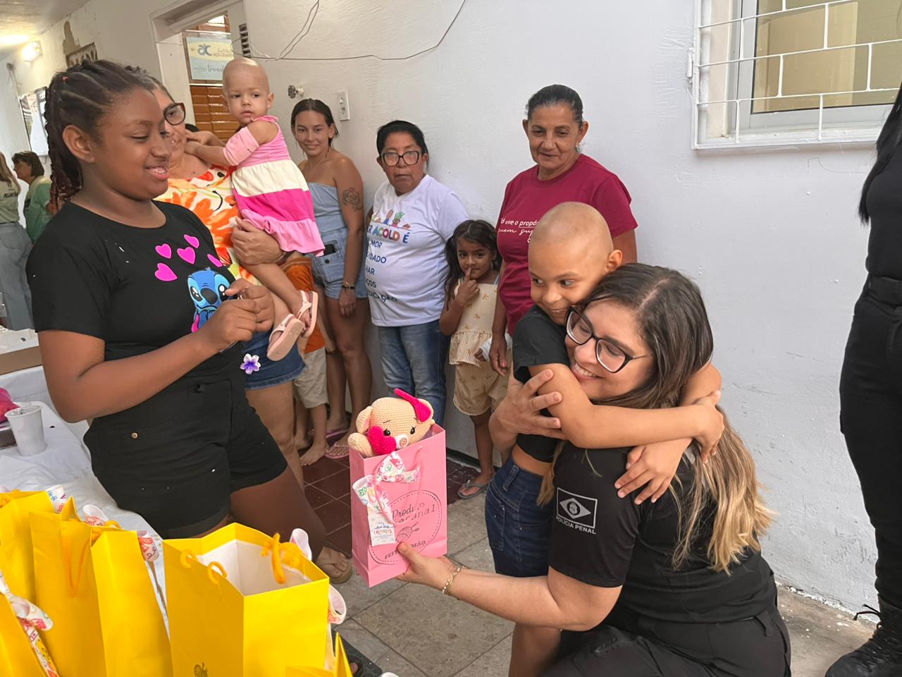 As policiais penais e internos da Unidade Prisional Francisco Hélio Viana de Araújo (UP-Pacatuba), em parceria com o Instituto VOO, promoveram a celebração do Dia das Crianças da Associação Comunitária Lucas Dantas (Acold) com a entrega de 62 bonecos no estilo amigurumis, na última segunda-feira (20). A ação beneficente contou com a mão de obra voluntária dos internos do projeto “Rede Artesã”, que também contribuíram com a matéria-prima para a confecção dos brinquedos.