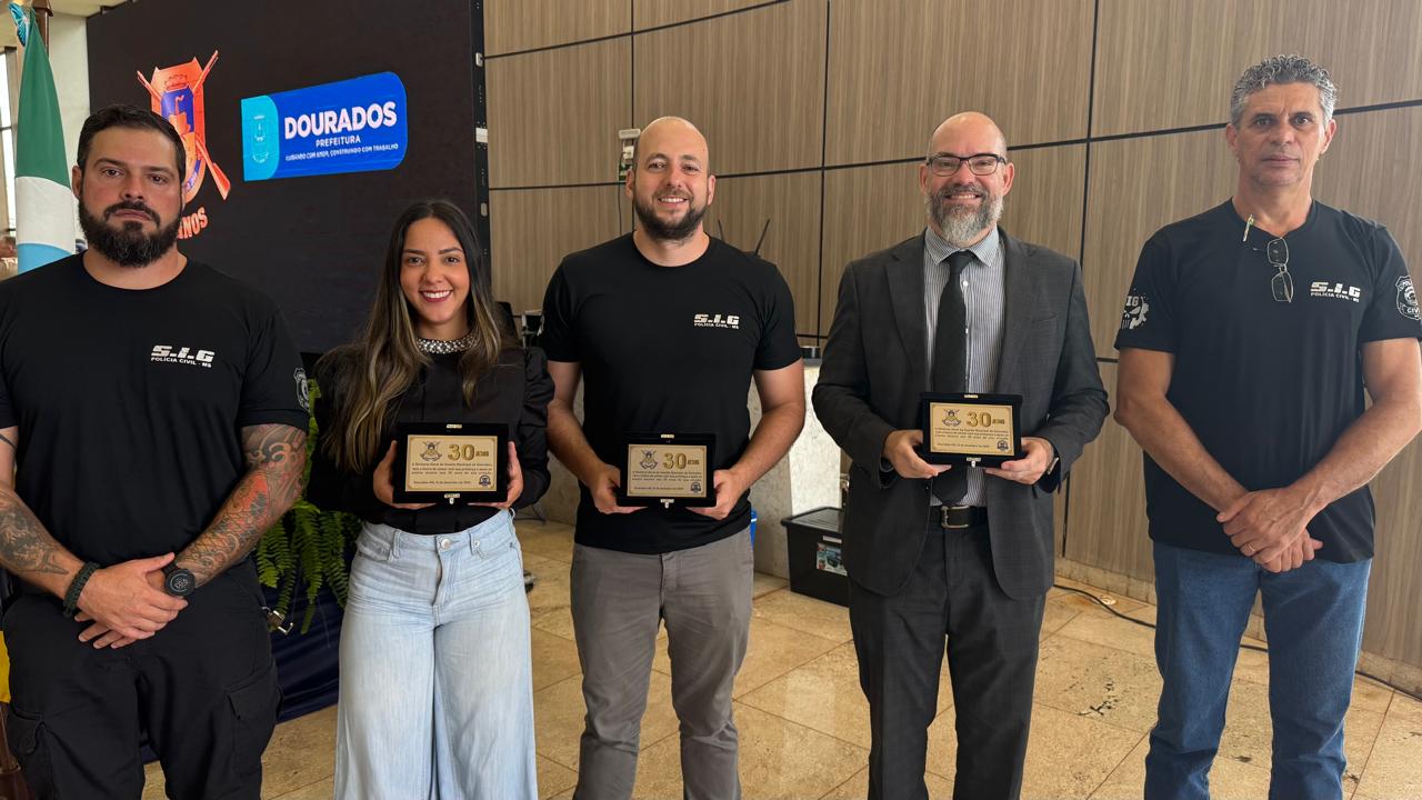 Na ocasião, o Delegado Regional – Adilson Stiguivitis Lima, o Delegado chefe da Seção de Investigações Gerais/Núcleo Regional de Inteligência (SIG/NRI) – Lucas Albé Veppo e a Delegada Titular da DAM – Ariana Gomes Albé, foram presenteados com uma placa comemorativa. A Polícia Civil parabeniza a Guarda Municipal de Dourados por seus 30 anos de existência e saúda a parceria ao longo desse período, destacando a importância da instituição para a segurança pública da cidade.
