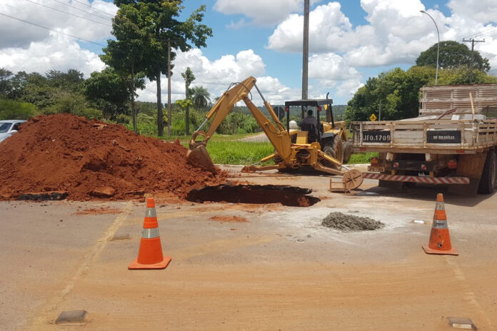 Participaram do trabalho oito servidores da Novacap, órgão responsável por serviços de águas pluviais. Após o reparo na rede, a equipe fez o aterro. O próximo passo será a colocação da capa asfáltica.
