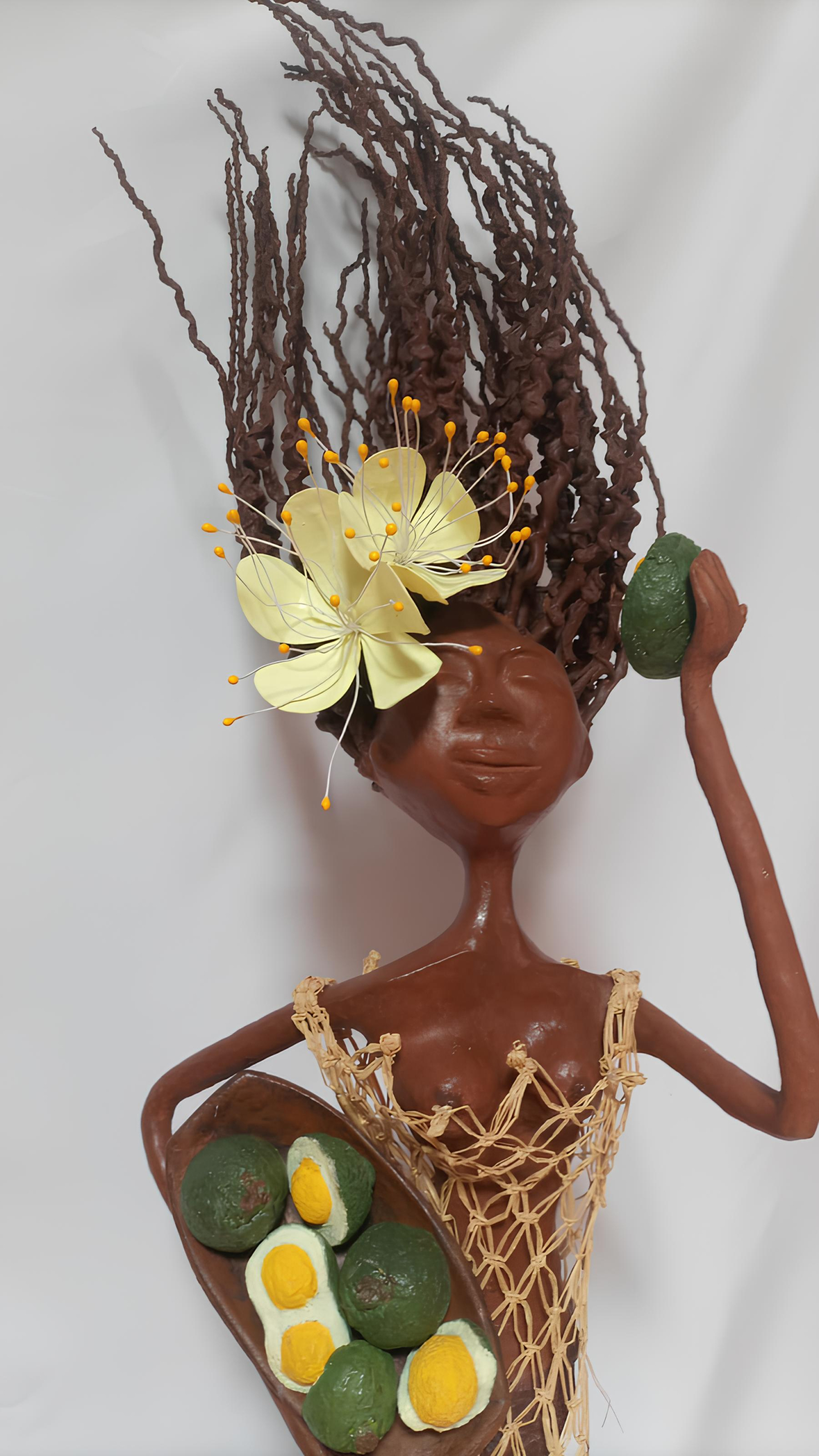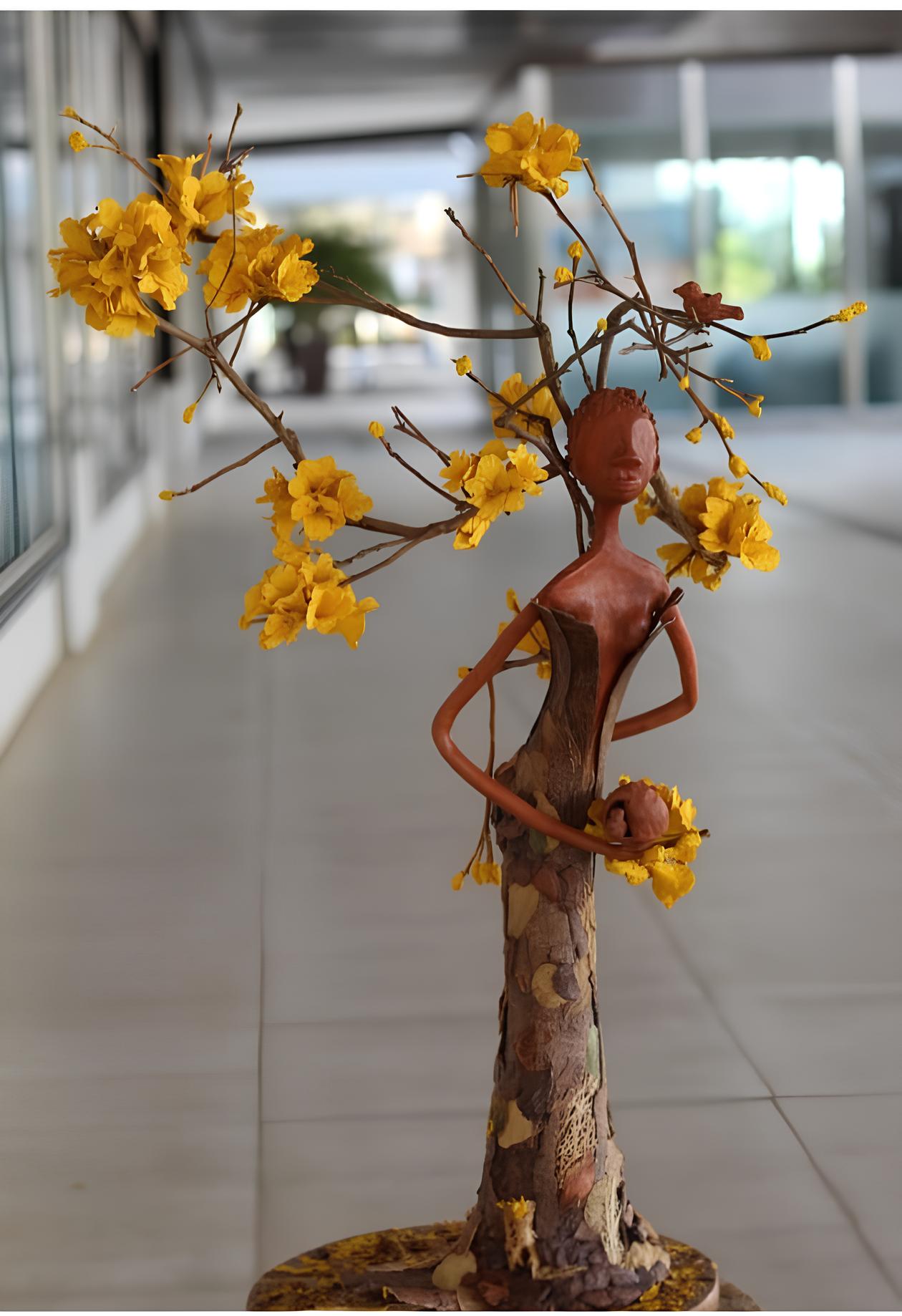 Incentivada a não desistir, seguiu participando das capacitações, aprimorando técnicas e explorando novas possibilidades criativas. Foi nesse processo que surgiu a “Mulher Pequi”, inspirada nos frutos do Cerrado goiano e criada inicialmente para um evento da Casa do Artesão. A obra ganhou destaque e deu origem a uma coleção com 14 peças, representando diferentes frutos do cerrado em forma de figuras femininas.