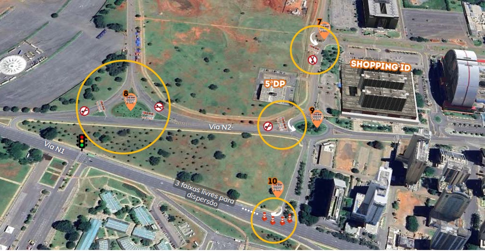 Na via N2, na altura da 5ª Delegacia de Polícia, haverá interdições para direcionar o tráfego ao Eixo Monumental. O cruzamento da via N2/W3 Norte, próximo ao Brasília Shopping, será fechado, e a sinalização reforçada para favorecer a dispersão no sentido W3 Norte.