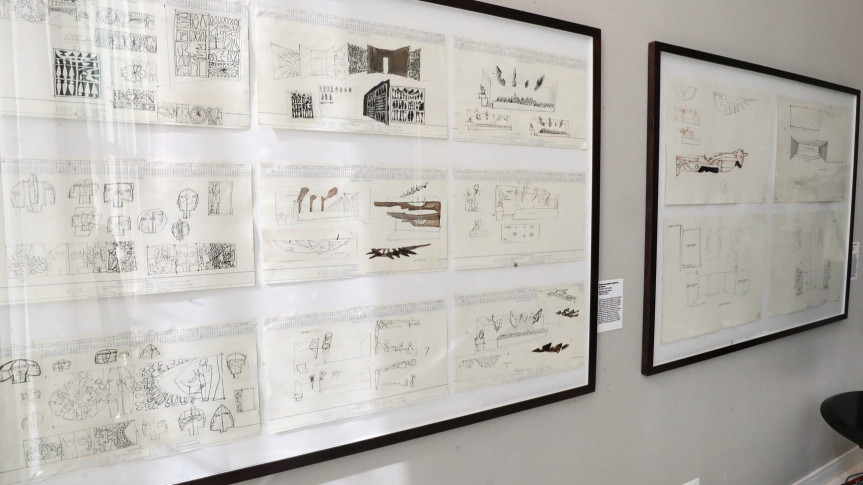 Desenhados em papéis de calendário com amplos espaços brancos e o aviso “risque e rabisque”, há esboços que detalham a criação do painel “Sol, pinhão e três planaltos”; e do amplo mural de concreto aparente “Símbolos do Paraná”, ambos presentes no térreo do edifício. Também estão expostos os rascunhos que resultaram nos entalhes de madeira batizados de “Ceifador” –  inicialmente previstos para compor a Tribuna de Honra, e que hoje estão na entrada do Plenário. Por fim, há ainda os traçados iniciais de “Assembleia”, o imenso mural de madeira do Plenarinho que faz uma leitura da política no Paraná.