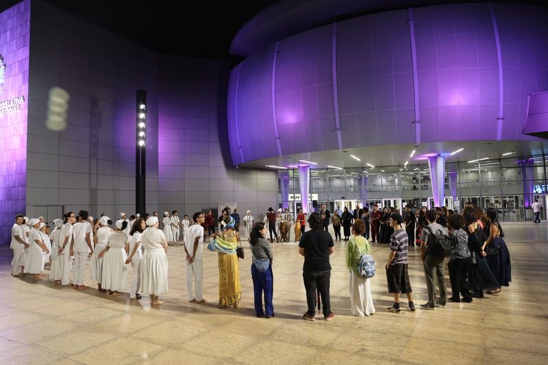 A abertura da exposição “O Olho de vidro sobre o sagrado vivo”, no Palácio Maguito Vilela, foi realizada na noite dessa quarta-feira, 5, com cerimônias, rezas e outros elementos do candomblé e da umbanda. A mostra reúne trabalhos de dez artistas do Coletivo Onã, formado por jovens frequentadores, chamados filhos, do terreiro Morada do Cruzeiro, uma casa dedicada ao culto aos orixás.