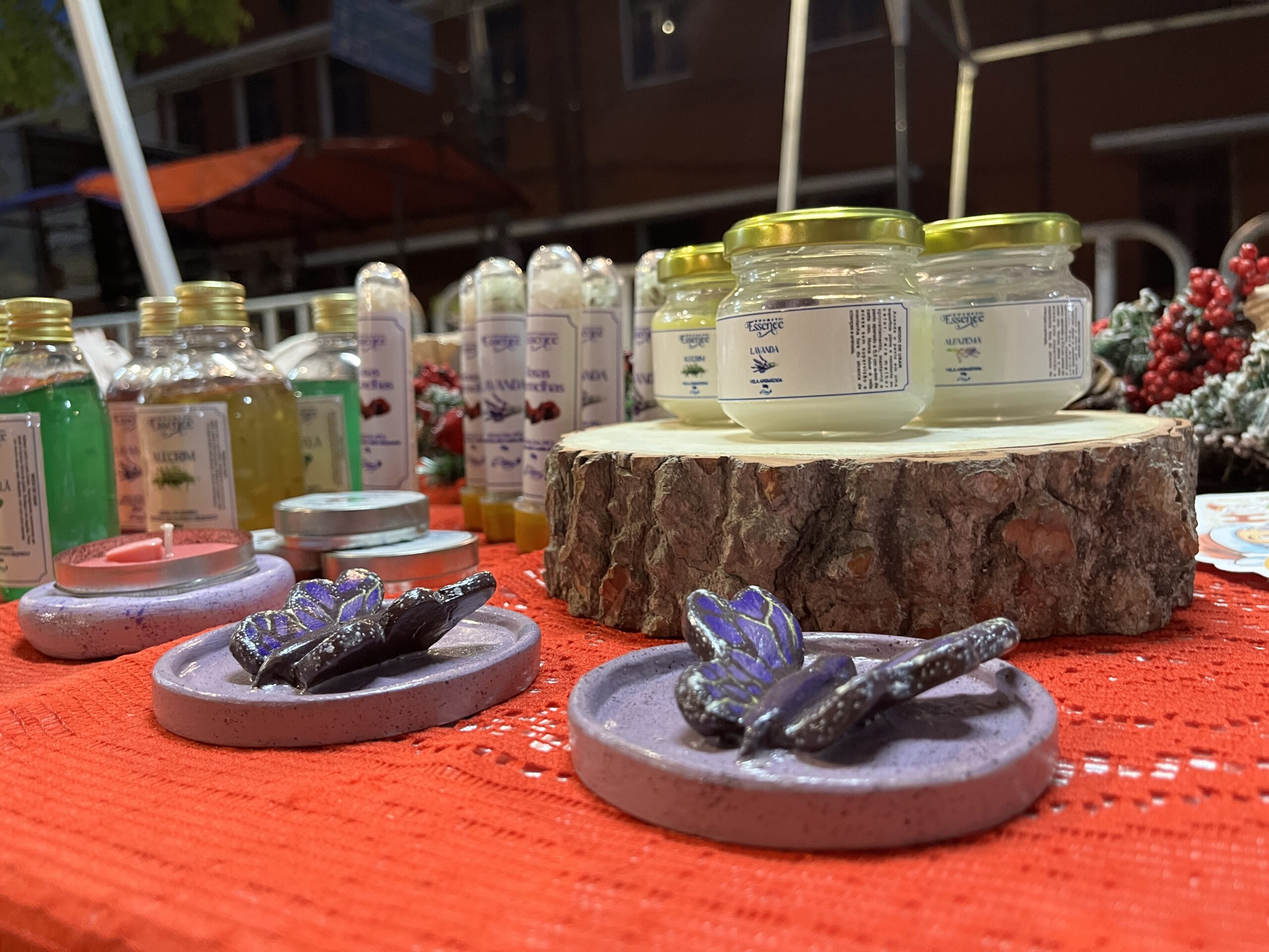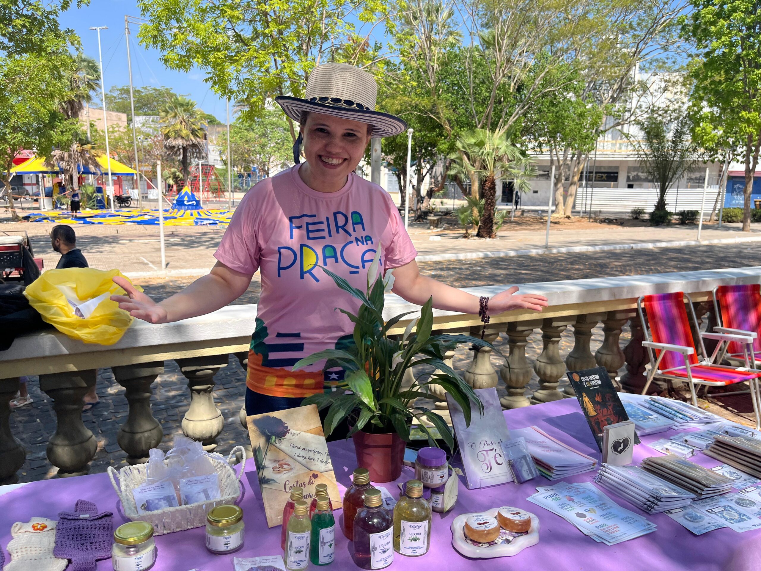 A marca, que nasceu no campo editorial, expandiu-se para o universo do autocuidado, com a produção artesanal de velas aromáticas, esfoliantes e escalda-pés. Lara conheceu a feira pelas redes sociais e ingressou no grupo de WhatsApp dos organizadores para participar da Feira na Praça. “Começamos com custo zero e hoje há uma coparticipação simbólica. É tudo muito acessível”, conta.