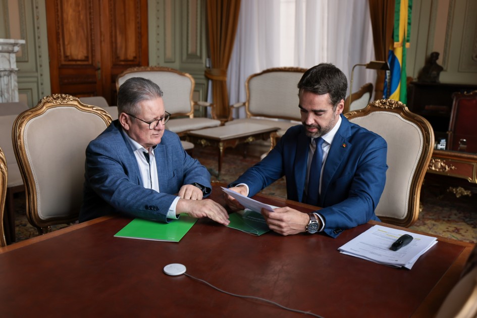 O governador Eduardo Leite recebeu, na sexta-feira (31/10), um relatório dos resultados do Banco Regional de Desenvolvimento do Extremo Sul (BRDE) durante a gestão do diretor-presidente do banco, Ranolfo Vieira Júnior, que está encerrando o seu ciclo no cargo. No documento, Ranolfo destaca o avanço positivo do banco em termos de carteira de crédito, resultados operacionais e no fortalecimento da política de diversificação das fontes de financiamento. A troca na presidência obedece ao rodízio entre os três Estados controladores do banco.