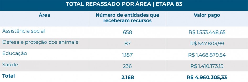 Foram contempladas mais de 2 mil instituições que prestam serviços na área de assistência social, defesa e proteção dos animais, educação e saúde – impulsionando sua atuação e ajudando na manutenção de suas atividades. Esta é a etapa 83, referente ao segundo trimestre de 2025. Os dados por estabelecimento, por região, por município e por área podem ser conferidos neste endereço.