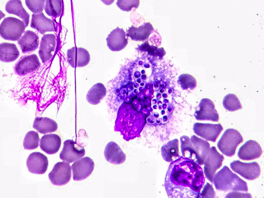 Imagem de microscópio revela mostra de sangue concentrada em leucócitos para o diagnóstico laboratorial da histoplasmose disseminada