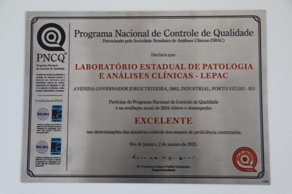 O desempenho técnico e a precisão dos resultados laboratoriais renderam ao Lepac, neste ano, o segundo Certificado de Excelência concedido pelo Programa Nacional de Controle de Qualidade (PNCQ), da Sociedade Brasileira de Análises Clínicas (SBAC), em reconhecimento ao trabalho realizado durante o exercício de 2024.