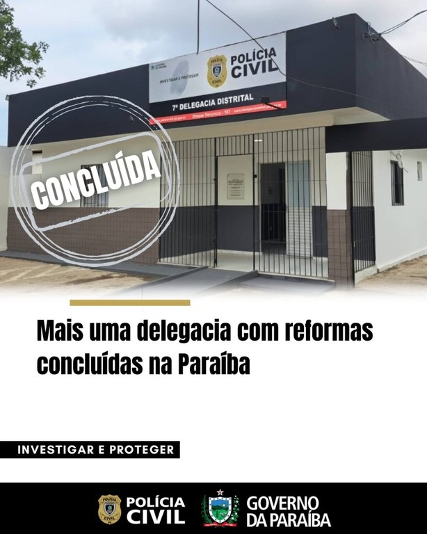 A Delegacia-Geral da Polícia Civil da Paraíba concluiu a reforma de mais uma unidade policial no estado. Trata-se da 7a Delegacia Distrital de Campina Grande, localizada no Bairro das Cidades. O retorno dos trabalhos na unidade está previsto para esta semana.