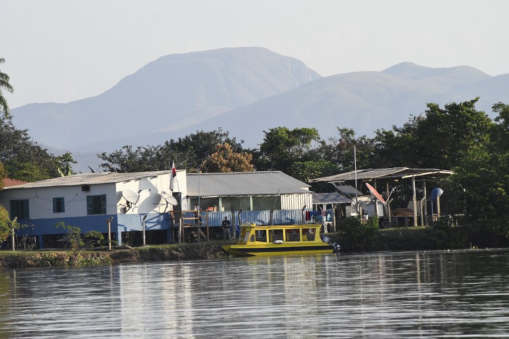 Comunidade ribeirinha do Pantanal, com a Serra do Amolar ao fundo