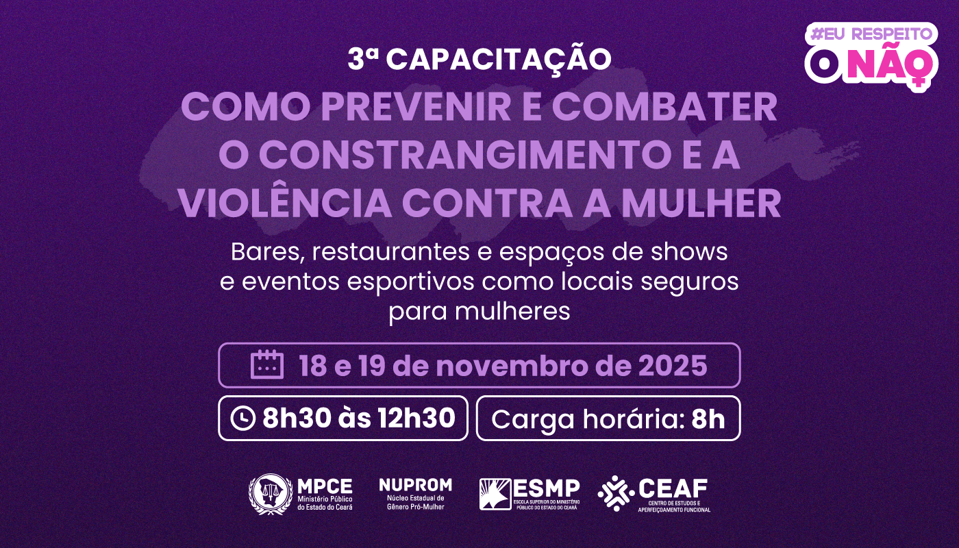 Nos dias 18 e 19 de novembro, o Ministério Público do Ceará, por meio do Núcleo Estadual de Gênero Pró-Mulher (Nuprom), realizará a 3ª edição da capacitação “EU RESPEITO O NÃO”. Aberto ao público, o treinamento tem como objetivo qualificar os trabalhadores de estabelecimentos comerciais e empresas de entretenimento para prevenir e combater a violência e o assédio de gênero, e para prestar o acolhimento e encaminhamento adequado das vítimas à rede de apoio e proteção. A formação será realizada de forma presencial, a partir das 8h30, na Escola Superior do Ministério Público (ESMP), com carga horária total de 8h. As inscrições estão abertas e podem ser realizadas por meio do link: https://cursos.mpce.mp.br/.