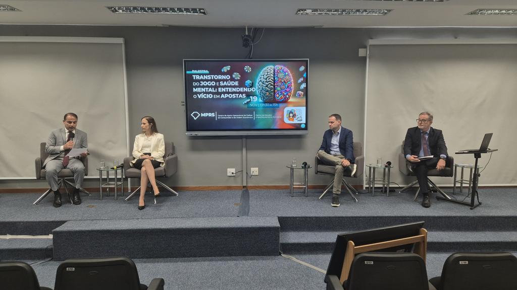 O Ministério Público do Rio Grande do Sul (MPRS), por iniciativa do Centro de Apoio Operacional do Consumidor e da Ordem Econômica (CAOCON) e do Centro de Estudos e Aperfeiçoamento Funcional (CEAF), realizou nesta quarta-feira, 19 de novembro, a palestra “Transtorno do Jogo e Saúde Mental: Entendendo o Vício em Apostas”. A atividade integra o Programa PertenSER e teve como objetivo esclarecer os impactos do vício em apostas, alertando para o alto potencial de dependência e suas consequências à saúde mental e à vida econômica das pessoas.