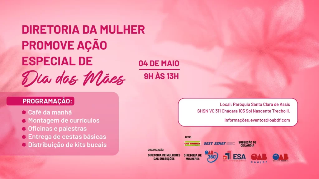Em uma iniciativa voltada para o acolhimento e a valorização das mulheres, a Seccional do Distrito Federal da Ordem dos Advogados do Brasil (OAB/DF), por meio de sua Diretoria de Mulheres, das Diretorias de Mulheres das Subseções e da Caixa de Assistência dos Advogados (CAADF), realizará uma “Ação Especial de Dia das Mães“, na próxima segunda-feira, 4 de maio, a partir das 9h até 13h. O evento ocorrerá na Paróquia Santa Clara de Assis, no Sol Nascente.