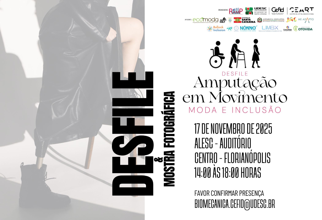 O Desfile Amputação em Movimento – Moda e Inclusão também conta com os seguintes parceiros: Projeto Natação e Polo Aquático para Todos (NPA), da Udesc Cefid; institutos Me Adapto, Alke e Otovida; Projeto Patinhas Solidárias, da Universidade do Sul de Santa Catarina (UniSul); consultoria Consolidar; e healthtechs (empresas de saúde e tecnologia) Nonno – Cuidadores de Idosos e LimbX – Próteses Biônicas.