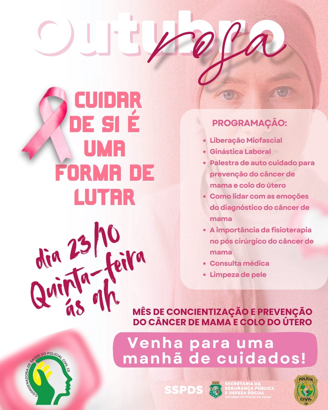 A Polícia Civil do Estado do Ceará (PCCE), por meio da Coordenadoria de Saúde, realiza nesta quinta-feira (23) uma manhã de cuidados voltada aos policiais e servidores da Delegacia Geral de Polícia, em alusão à campanha Outubro Rosa.