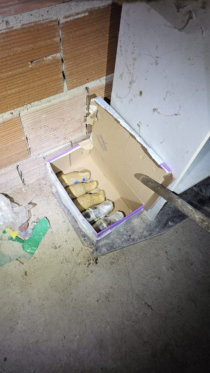 Com as informações repassadas pelo suspeito, em um imóvel abandonado nas proximidades, foram localizados 19 tabletes de maconha (19,34 kg), quatro tabletes de cocaína (4,5 kg), seis tabletes de crack (6 kg), balanças de precisão e industriais, sacos plásticos, celulares e cinco granadas. A área foi isolada, e o Esquadrão Antibombas do Batalhão de Operações Policiais Especiais (BOPE) foi acionado para o recolhimento e posterior detonação, em segurança.
