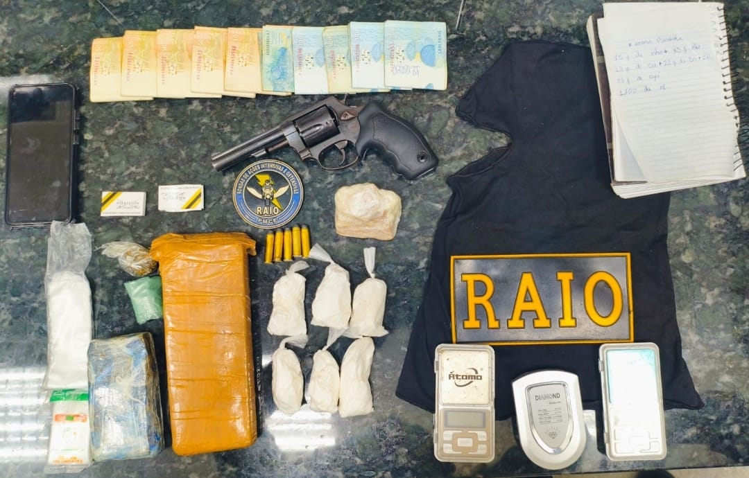 Na sequência, os policiais foram recebidos pela responsável pelo imóvel, que autorizou voluntariamente a entrada da equipe. Durante as buscas no interior da residência, foi localizada, debaixo da cama do suspeito, uma bolsa contendo um revólver calibre .38, com cinco munições calibre .32. Também foram encontrados entorpecentes, balanças de precisão, um caderno com anotações relacionadas ao tráfico de drogas, materiais utilizados para o preparo e embalagem de substâncias ilícitas e a quantia de R$ 10.000,00 em espécie.