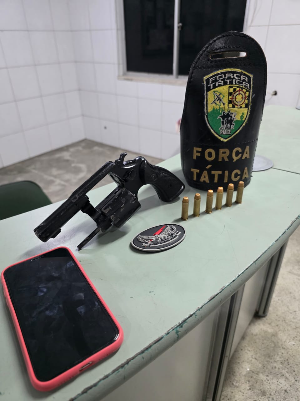 A ocorrência teve início por volta das 3h30, quando a equipe policial realizava incursões na região e visualizou três pessoas em atitude suspeita, sendo dois homens e uma mulher. Ao perceberem a presença policial, os indivíduos tentaram fugir correndo por becos e vielas da comunidade. Durante o acompanhamento, a composição conseguiu abordar um dos suspeitos, que portava um revólver calibre .38, municiado com seis cartuchos.