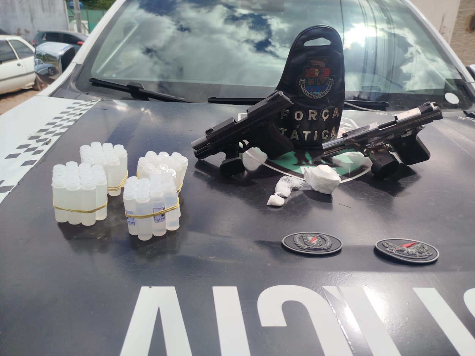 Equipes do 18º Batalhão da Polícia Militar do Ceará (PMCE) apreenderam, na manhã deste domingo (16), duas pistolas, munições e entorpecentes em uma festa no bairro Bonsucesso, em Fortaleza. As diligências ocorreram após alerta do videomonitoramento, da Secretaria da Segurança Pública e Defesa Social (SSPDS), sobre indivíduos armados em um evento na comunidade.