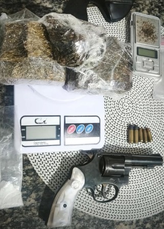 Durante a abordagem, os policiais localizaram, no interior da residência, 563 gramas de maconha, cinco gramas de cocaína, duas unidades de ecstasy, além de um revólver calibre .32, com cinco munições. Também foram apreendidos materiais utilizados para o fracionamento e embalagem de drogas, além da quantia de R$ 5.426,00 em espécie.