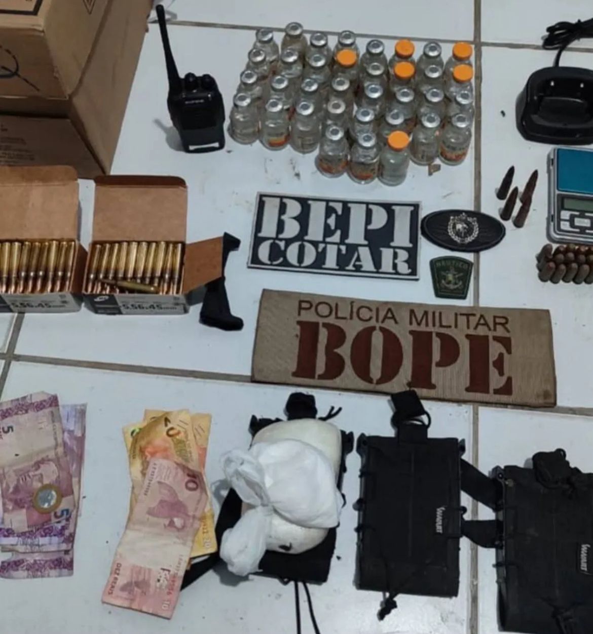 Durante a incursão, um dos acampamentos foi localizado, mas os suspeitos conseguiram fugir do local antes da chegada dos policiais. Na área abandonada, foram encontrados diversos materiais, incluindo 101 munições calibre 5.56, quatro munições calibre 7.62 e 23 munições calibre .40. Também foram apreendidos 382 gramas de cocaína, 35 frascos de xilocaína, duas balanças de precisão, rádios comunicadores, mochilas, coldres, cinturões táticos e uniformes camuflados, entre outros objetos utilizados para atividades criminosas.