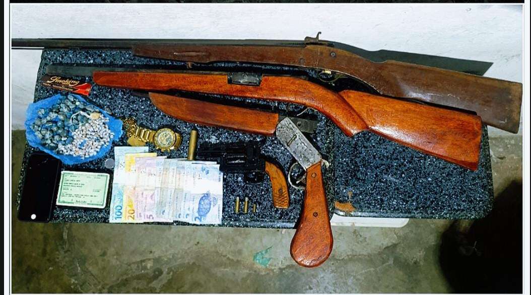 A Polícia Militar do Ceará (PMCE) apreendeu quatro armas de fogo e uma quantidade de drogas, durante uma ação realizada por volta de 0h40 deste sábado (8), no bairro Coaçu, em Pacajus, na Região Metropolitana de Fortaleza. A ocorrência, conduzida por policiais do Comando de Policiamento de Rondas de Ações Intensivas e Ostensivas (CPRaio), resultou na apreensão de uma espingarda industrial sem calibre definido, duas espingardas artesanais, de calibres 28 e .22, e um revólver artesanal calibre .32, além de munições deflagradas e intactas de diferentes calibres. Além dos entorpecentes, também foram recolhidos um celular, um relógio, um cordão dourado e R$ 145,00 em espécie.