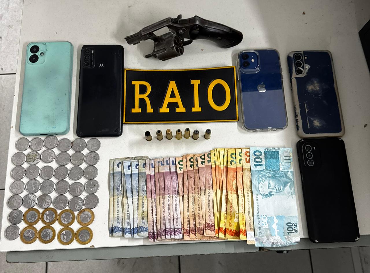 No local, os policiais apreenderam um revólver calibre .38, com numeração suprimida e munições deflagradas, além de uma mochila contendo seis aparelhos celulares e dinheiro em espécie. A motocicleta roubada foi recuperada e também apresentada na delegacia.