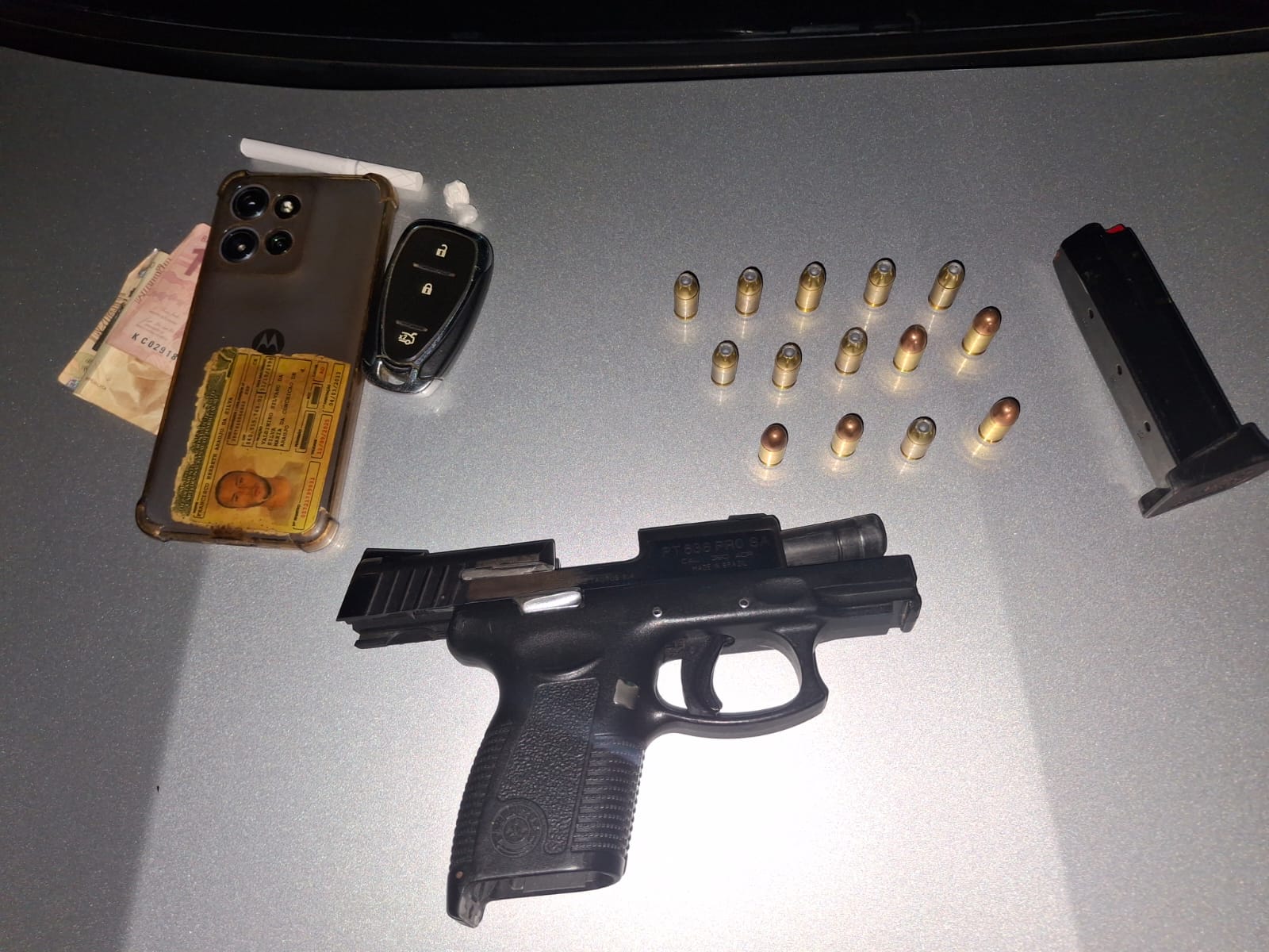 Por volta de 1h, uma do 21º BPM realizava diligências pela rua Guilhermina Rocha quando avistou um veículo parado com o motor ligado. Ao se aproximarem, os policiais realizaram a abordagem. Durante a busca veicular, foi encontrada uma pistola calibre .380 com 14 munições.