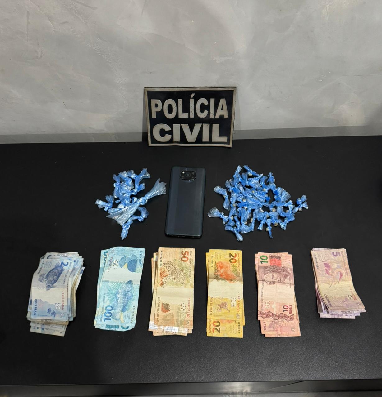 No interior do imóvel, foram apreendidas 11 trouxinhas de cocaína, pesando 4,64 gramas, e 44 trouxinhas de crack, pesando 17,1 gramas. Com o suspeito também foram encontrados R$ 1.061,00 em diversas notas, característicos da atividade de microtráfico, além de um aparelho celular.