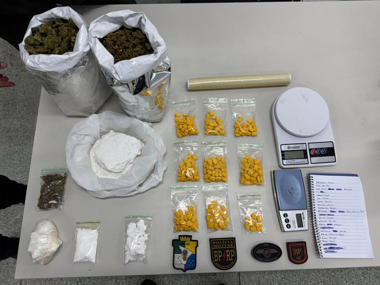 Em decorrência da situação, os militares fizeram as devidas verificações na bolsa, e depararam-se com drogas, balança de precisão, plástico filme e um caderno com anotações ilícitas.