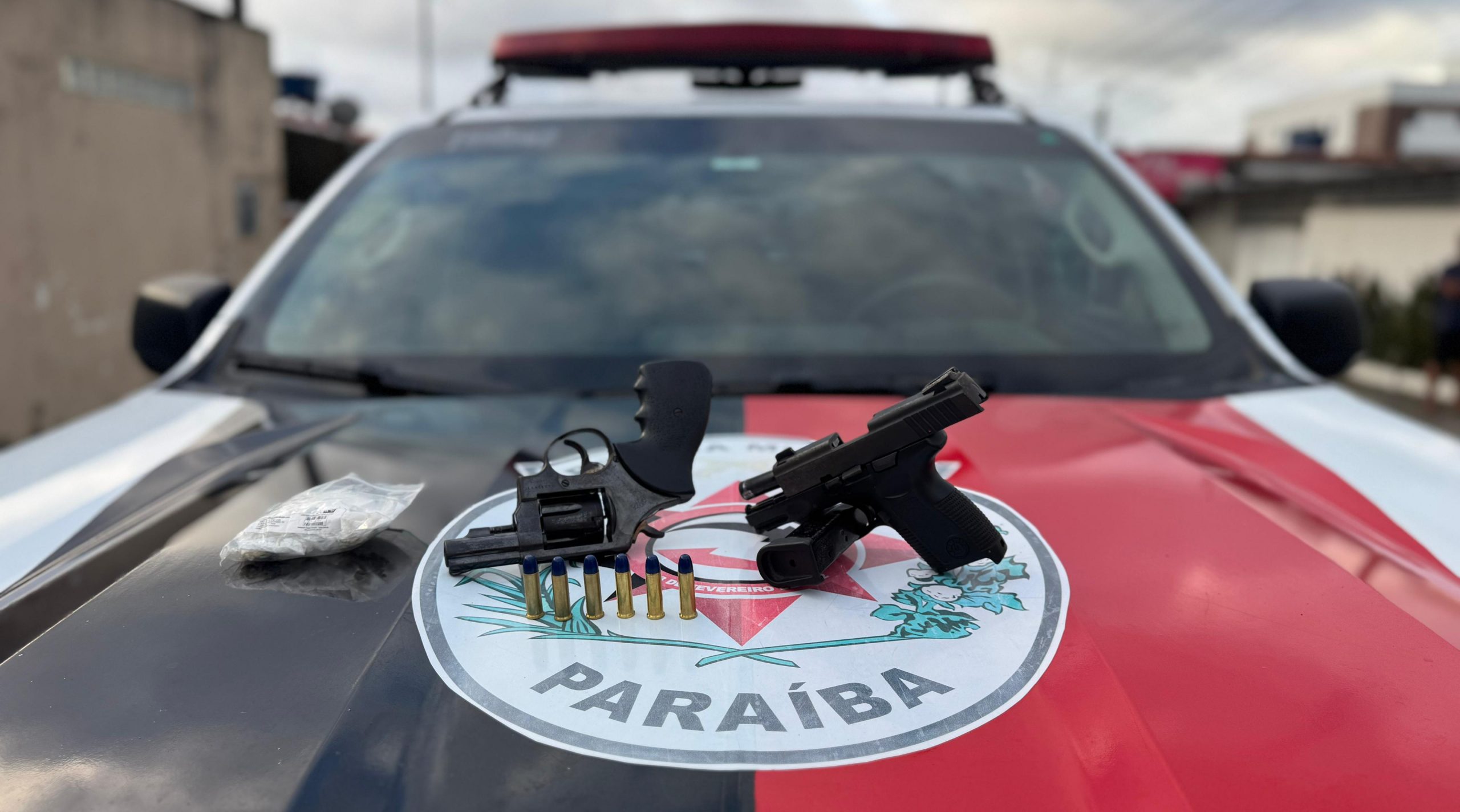 As equipes estavam realizando policiamento tático no bairro do Cristo, quando interceptaram um indivíduo em atitude suspeita. Na abordagem, foram encontradas drogas e duas armas de fogo, um revólver e uma pistola, com munições intactas.