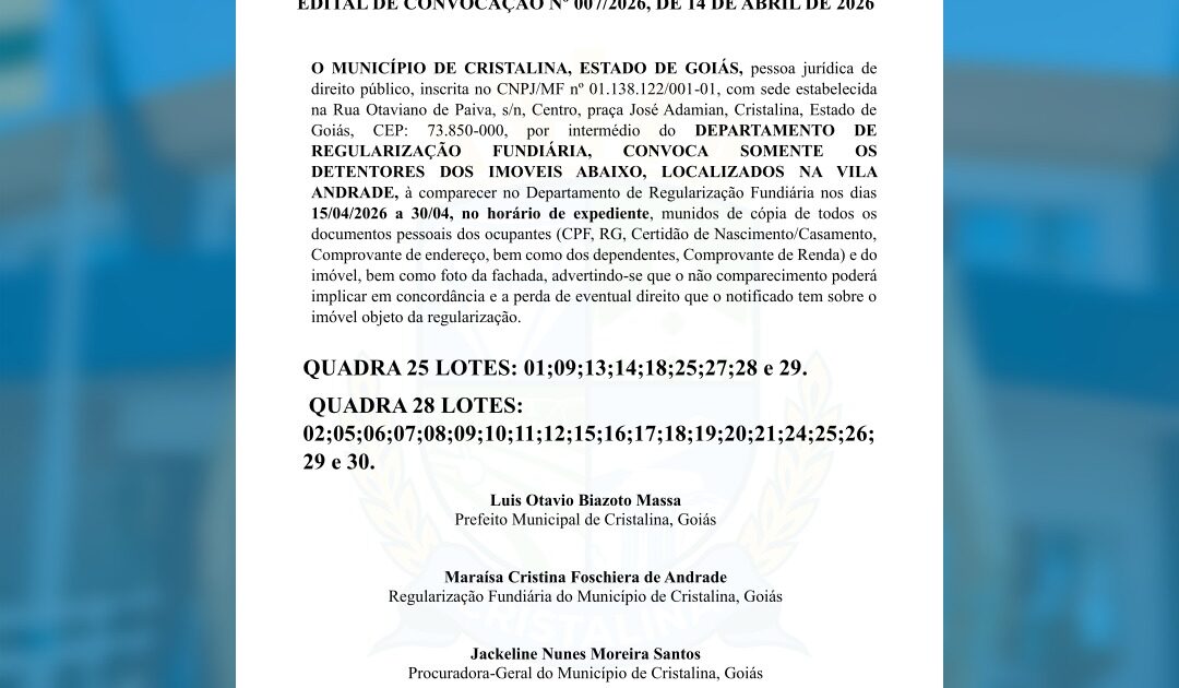 A Prefeitura de Cristalina, por meio do Departamento de Regularização Fundiária, publicou o Edital de Convocação nº 007/2026, de 14 de abril de 2026, convocando os detentores de imóveis localizados na Vila Andrade para darem continuidade ao processo de regularização fundiária no município.