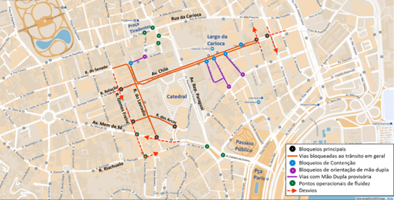 Durante o período, alterações momentâneas serão necessárias em algumas ruas para garantir a fluidez do trânsito. Haverá interdições viárias temporárias nas proximidades dos principais eventos – Aterro do Flamengo, Praça Mauá, Praça Tiradentes e Avenida República do Chile -, nas vias da orla, onde se concentram hotéis de delegações, e nas regiões dos aeroportos.