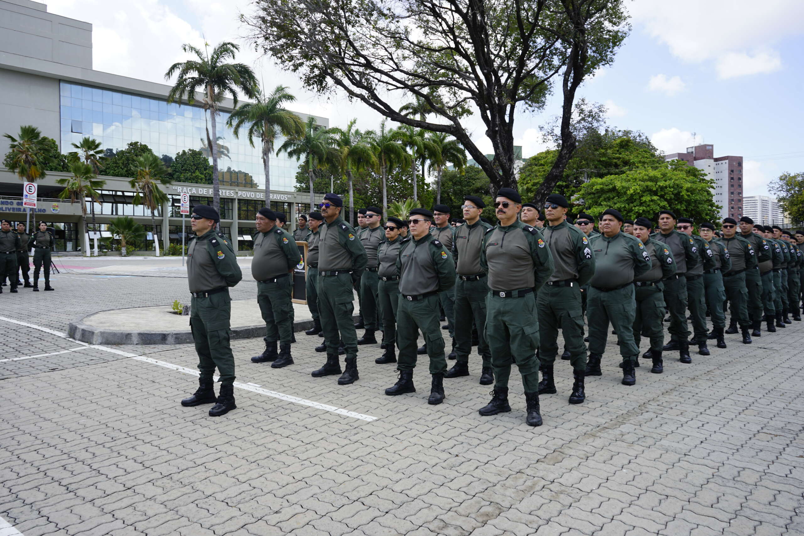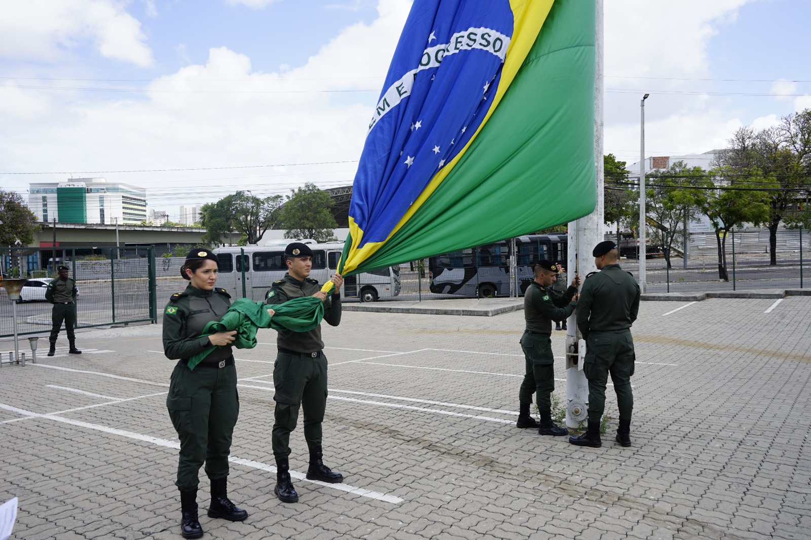 A Polícia Militar do Ceará (PMCE) realizou na tarde desta quarta-feira (19) solenidade alusiva ao Dia da Bandeira Nacional, instituída quatro dias após a Proclamação da República, rompendo com os símbolos monárquicos e trazendo uma nova simbologia ao Brasil republicano. A cerimônia, que tem como objetivo cultuar a bandeira nacional, símbolo de patriotismo e valor cívico, além de manter viva a tradição e o respeito ao símbolo nacional, foi realizada no pátio externo do Quartel do Comando Geral (QCG) no Centro Integrado de Segurança Pública (Cisp), assim como nos demais batalhões da corporação.
