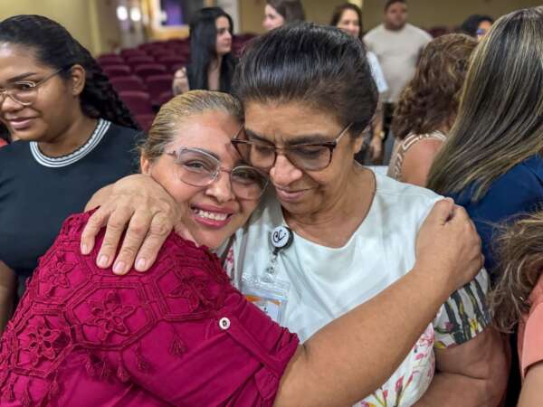 Cristiane, mãe de paciente acompanhada pelo HGF, abraça uma das enfermeiras que conheceu em 2014