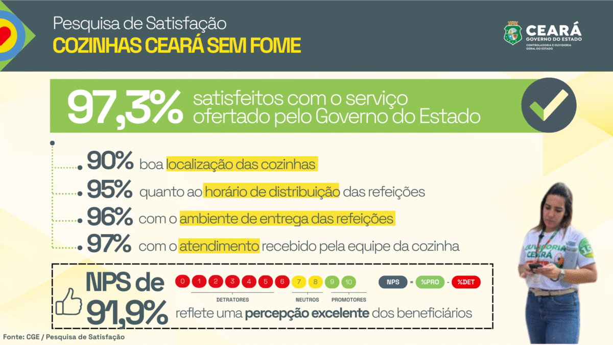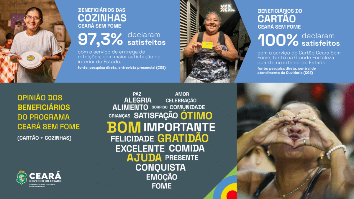 Conduzida pelos auditores de controle interno da Coordenadoria de Ouvidoria da CGE, Otacílio Júnior e Natália França, a pesquisa revelou elevado nível de satisfação entre os participantes. Entre os beneficiários das Cozinhas Ceará Sem Fome, 97,3% se declararam satisfeitos com o serviço, destacando a qualidade do atendimento, a organização da entrega e a boa localização das unidades. Já o Cartão Ceará Sem Fome registrou 100% de satisfação, com usuários relatando facilidade no uso e melhoria direta na alimentação e na estabilidade financeira de suas famílias.